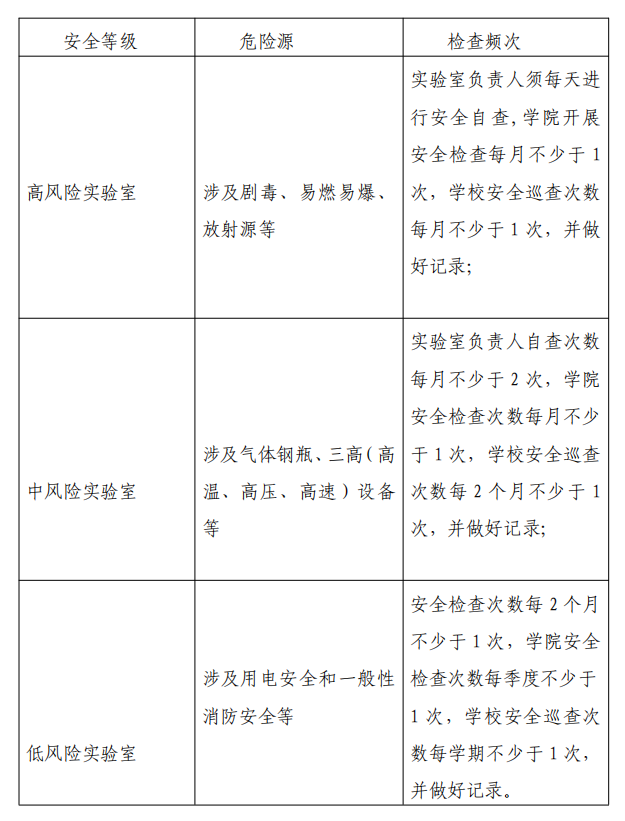 第六条 实验室安全检查频次应根据危险源类别和风险等级实施分级管理,重点加强对高危领域实验室的监管力度。具体检查要求如下表: