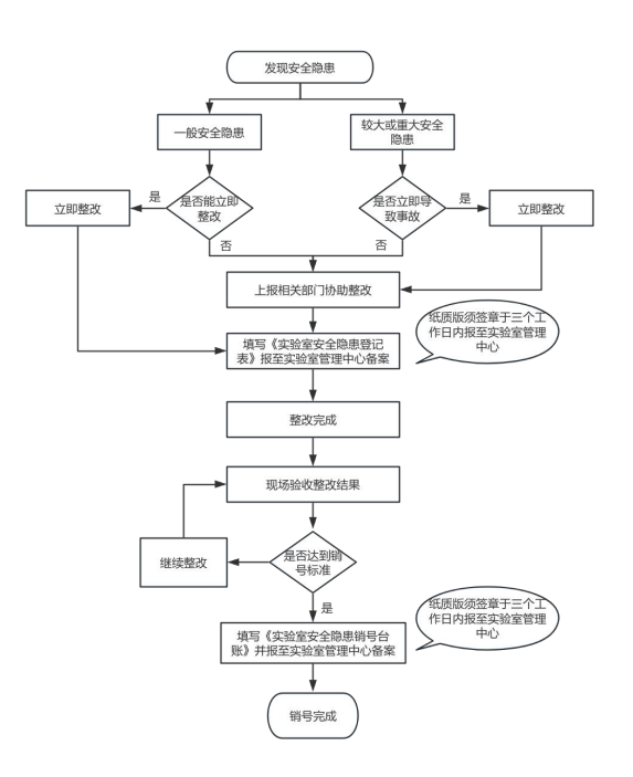 第十二条各单位对安全隐患应即知即改,如自身无法落实整改的,应按照责任归属报至相关部门协助整改,相关责任部门应及时响应,采取有效措施,落实整改工作,重大安全隐患必须停止相关实验活动,直至整改验收合格后方可恢复使用,具体安全隐患整改流程如下图: